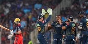 टॉस हारकर पहले बल्लेबाजी करने उतरी रॉयल चैलेंजर्स बेंगलुरु की टीम संघर्ष करती नजर आई। विराट कोहली (13 गेंदों में 28 रन) और जैकब बेथेल की तेज शुरुआत के बावजूद, मौजूदा चैंपियन ने नियमित अंतराल पर विकेट गंवाए। देवदत्त पड्डिकल ने सर्वाधिक 40 रन (24 गेंद) बनाकर अकेले संघर्ष किया। रजत पाटीदार (19) और टिम डेविड (9) जैसे सितारों से सजा मध्यक्रम फ्लॉप रहा। गुजरात के लिए अरशद खान ने शानदार गेंदबाजी करते हुए 3 विकेट झटके, जबकि राशिद खान और जेसन होल्डर को 2-2 विकेट मिले।
